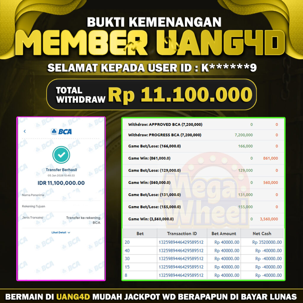 Setiap hari, member UANG4D berhasil meraih jackpot besar dari berbagai macam permainan livecasino ternama yang kami sediakan, seperti Roullete, Dragon & Tiger, Qiu Qiu dan masih banyak lagi. Kami secara rutin menampilkan bukti screenshot atau rekapan kemenangan yang berhasil diraih, mulai dari kemenangan ratusan ribu hingga puluhan juta rupiah. Semua slip kemenangan ini kami hadirkan untuk membuktikan bahwa di UANG4D, peluang menang itu nyata.