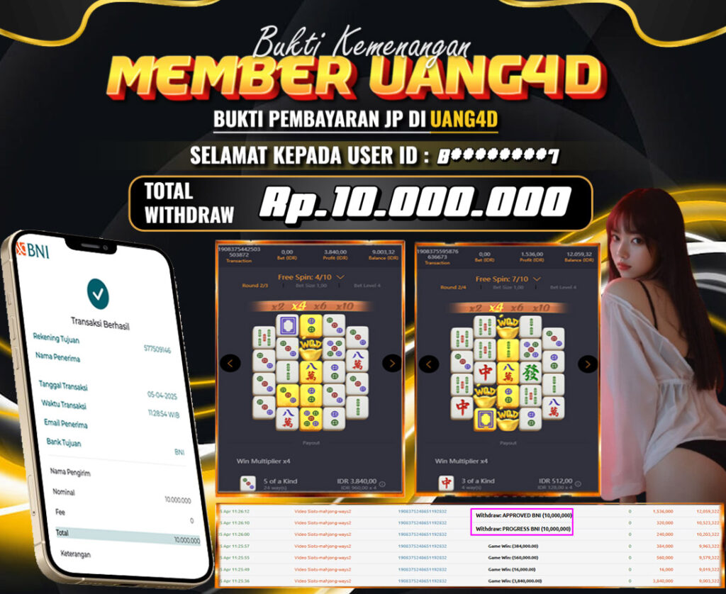 Jangan lewatkan kesempatan untuk meraih kemenangan besar. Daftar sekarang di UANG4D dan rasakan pengalaman bermain slot terbaik yang pernah ada! Putar gulungan, menangkan jackpot, dan jadilah bagian dari komunitas pemain sukses kami!
