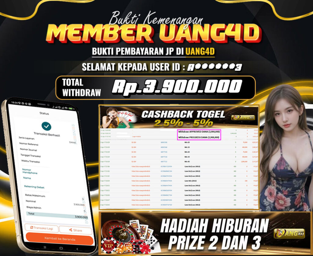 UANG4D dikenal sebagai situs terpercaya yang selalu menghadirkan pengalaman bermain slot online yang aman, fair, dan berlisensi resmi. Di sini, kami tidak hanya sekadar memberikan janji, tapi bukti nyata berupa slip kemenangan yang dapat Anda lihat secara langsung.