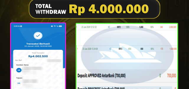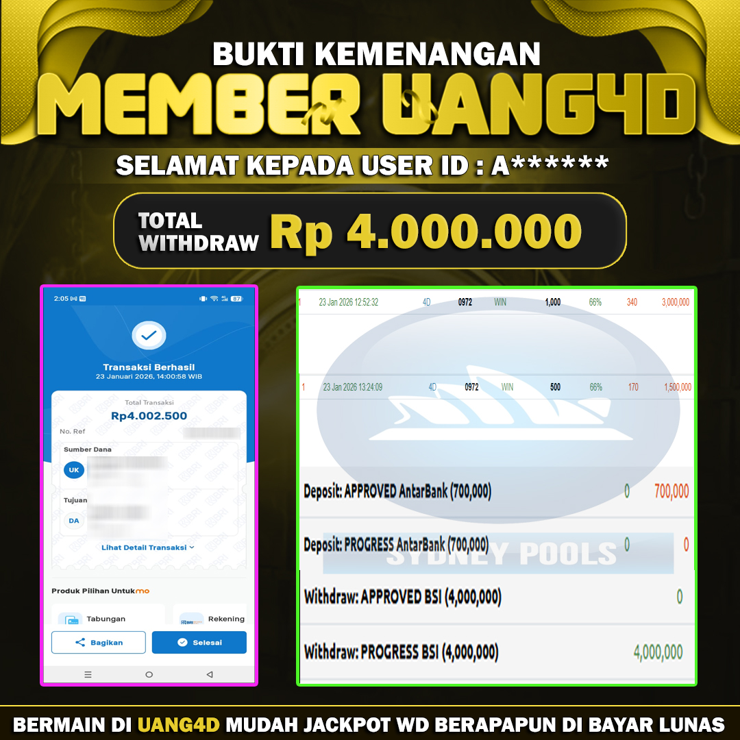 Setiap hari, member UANG4D berhasil meraih jackpot besar dari berbagai provider togel ternama yang kami sediakan, seperti Sydney, Singapore, Hongkong dan masih banyak lagi. Kami secara rutin menampilkan bukti screenshot atau rekapan kemenangan yang berhasil diraih, mulai dari kemenangan ratusan ribu hingga puluhan juta rupiah. Semua slip kemenangan ini kami hadirkan untuk membuktikan bahwa di UANG4D, peluang menang itu nyata.