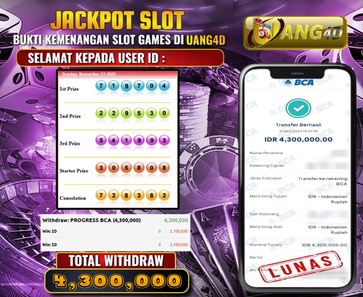 UANG4D dikenal sebagai situs terpercaya yang selalu menghadirkan pengalaman bermain slot online yang aman, fair, dan berlisensi resmi. Di sini, kami tidak hanya sekadar memberikan janji, tapi bukti nyata berupa slip kemenangan yang dapat Anda lihat secara langsung.