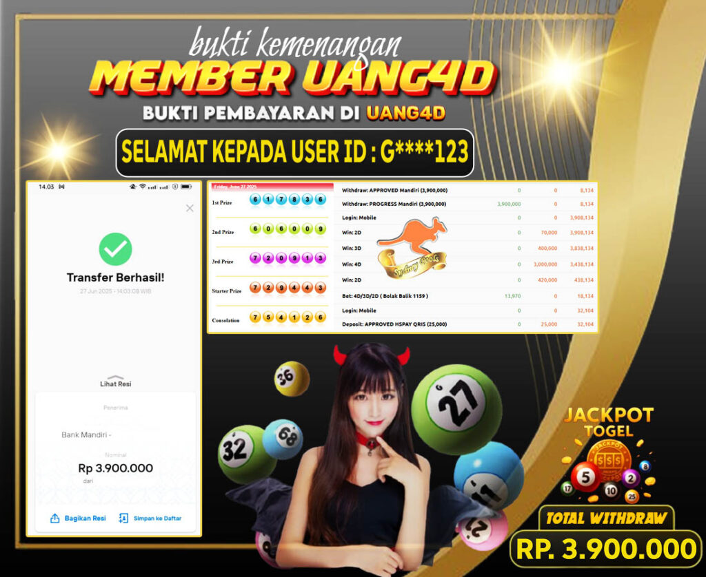 Setiap hari, member UANG4D berhasil meraih jackpot besar dari berbagai provider togel ternama yang kami sediakan, seperti Sydney, Singapore, Hongkong dan masih banyak lagi. Kami secara rutin menampilkan bukti screenshot atau rekapan kemenangan yang berhasil diraih, mulai dari kemenangan ratusan ribu hingga puluhan juta rupiah. Semua slip kemenangan ini kami hadirkan untuk membuktikan bahwa di UANG4D, peluang menang itu nyata.